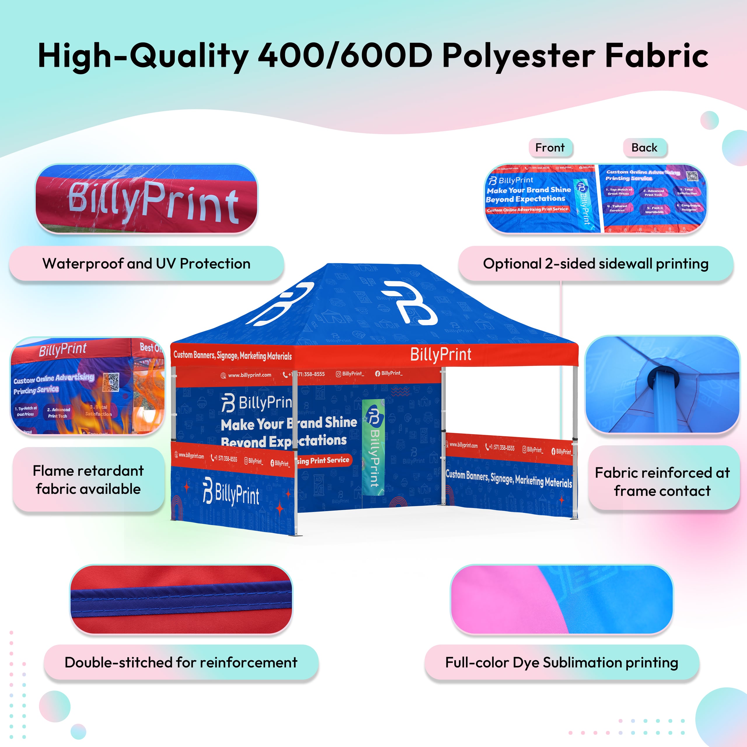 Both fabric offering excellent durability and protection. The 400D polyester comes with a PU coating, ensuring long-lasting performance even in abrasive conditions. The 600D polyester features flame-retardant properties, making it ideal for outdoor use where higher protection is required, providing reliable shade for your events.